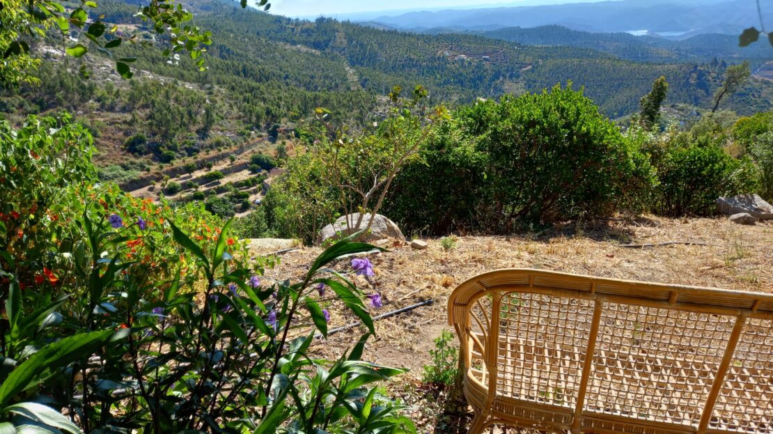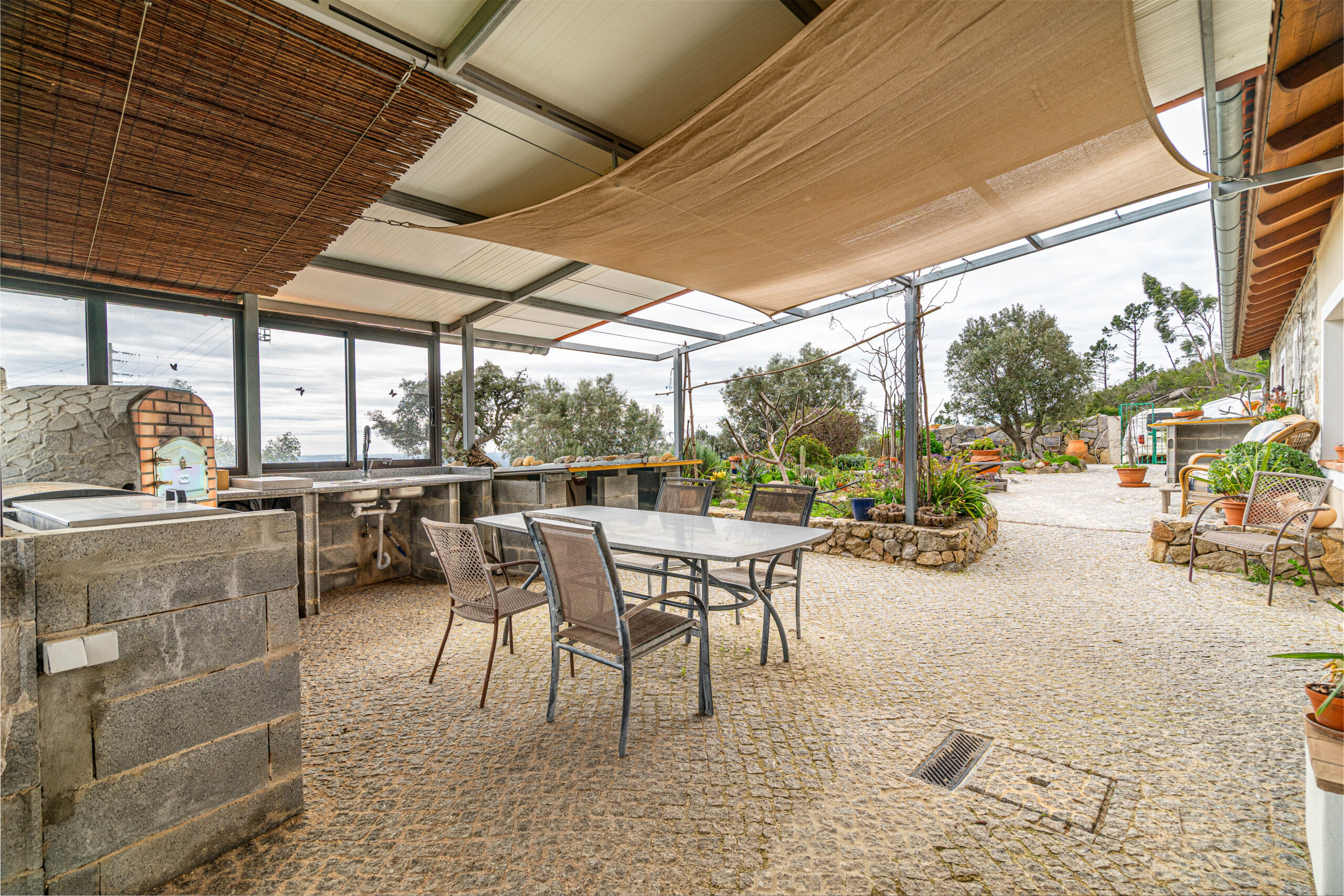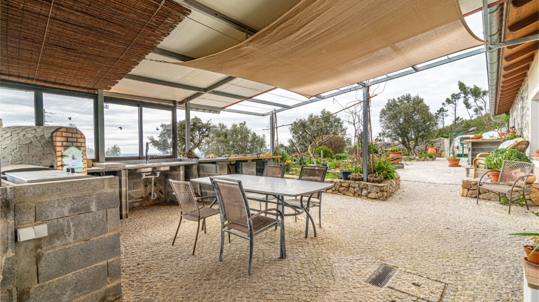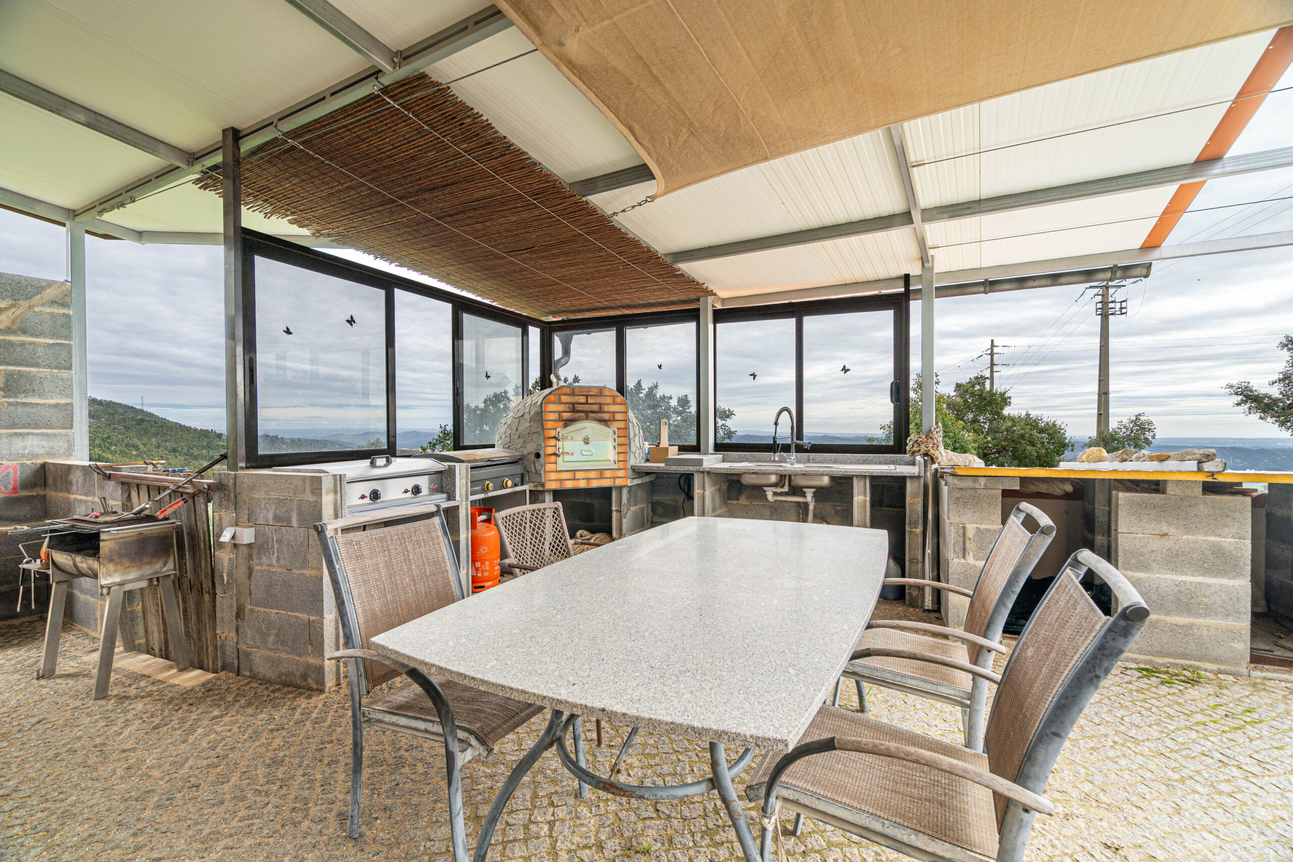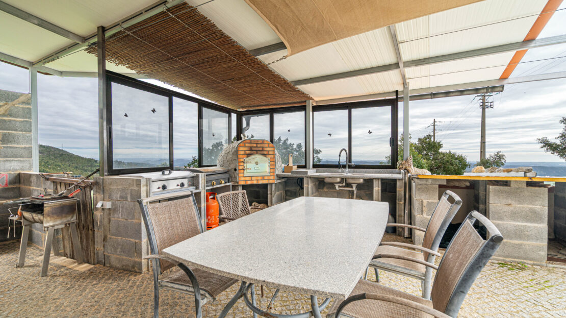 A sala de estar abre-se para um grande terraço com zona coberta, onde se encontra uma cozinha exterior totalmente equipada, com lava-louça, fogão a gás, forno a lenha para pão e área de churrasco. Existe ainda chuveiro exterior e ampla área de apoio, tudo com vistas panorâmicas sobre a paisagem envolvente.