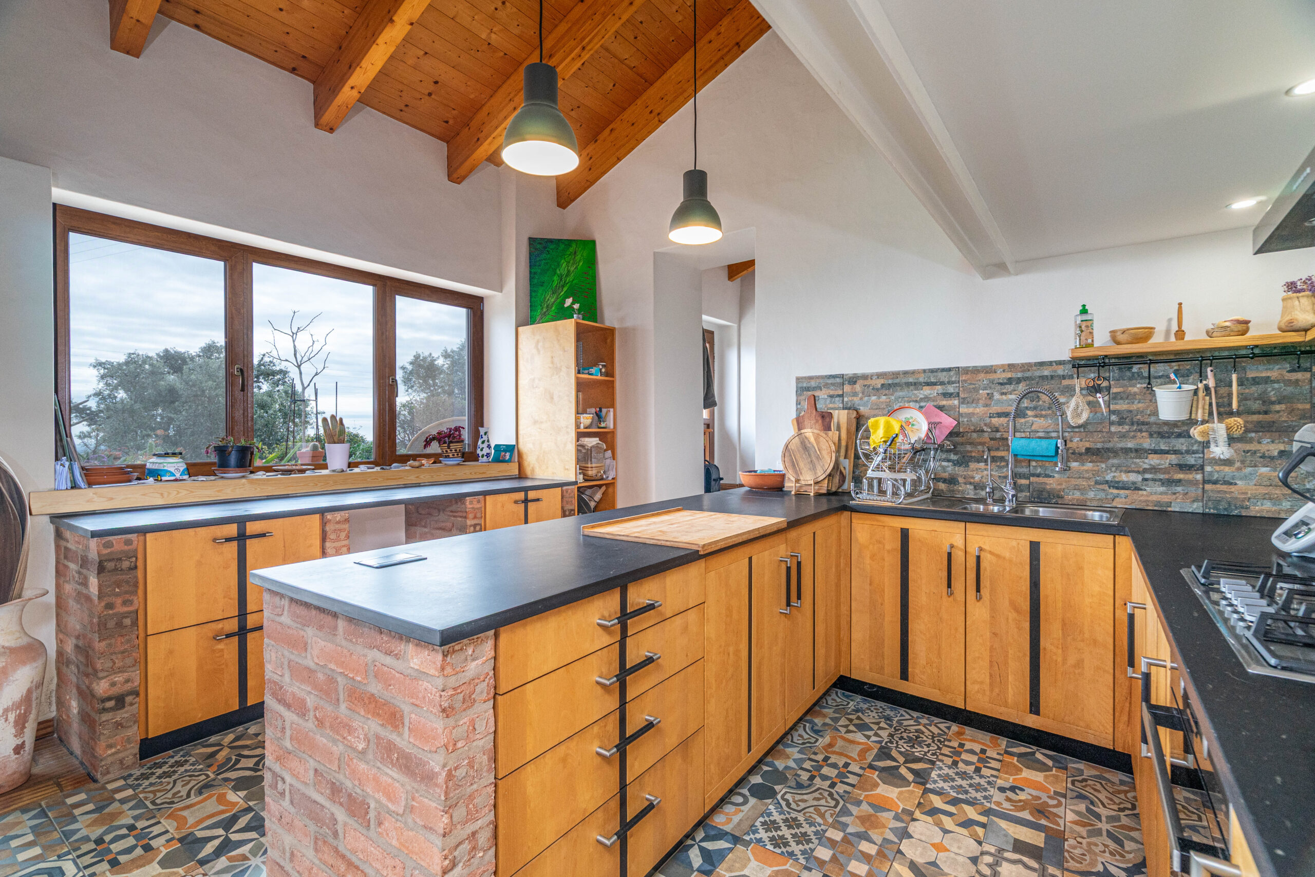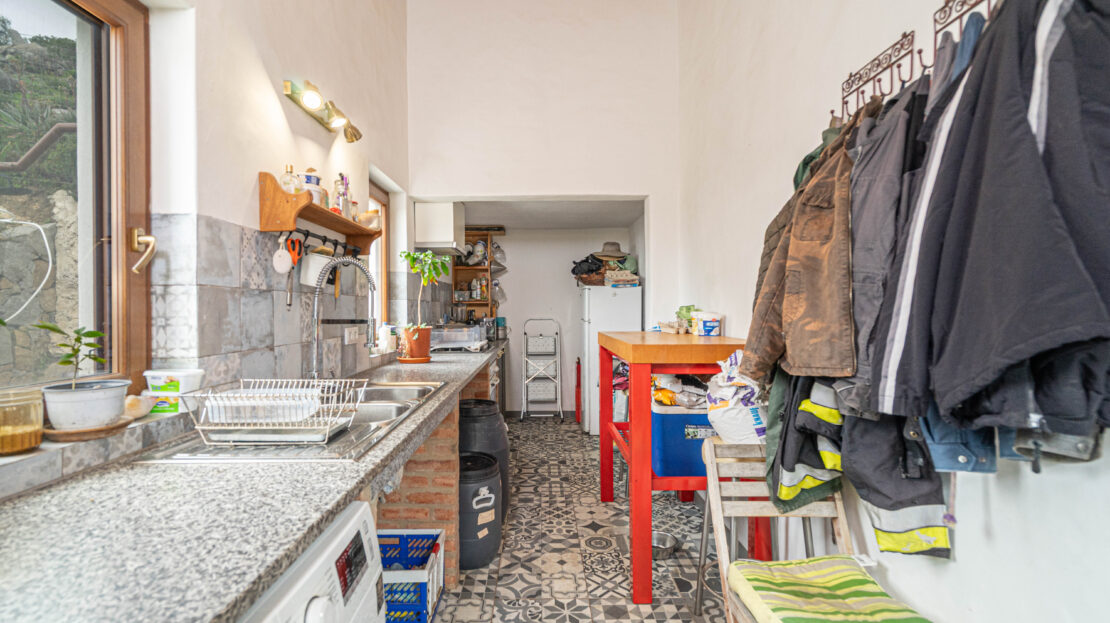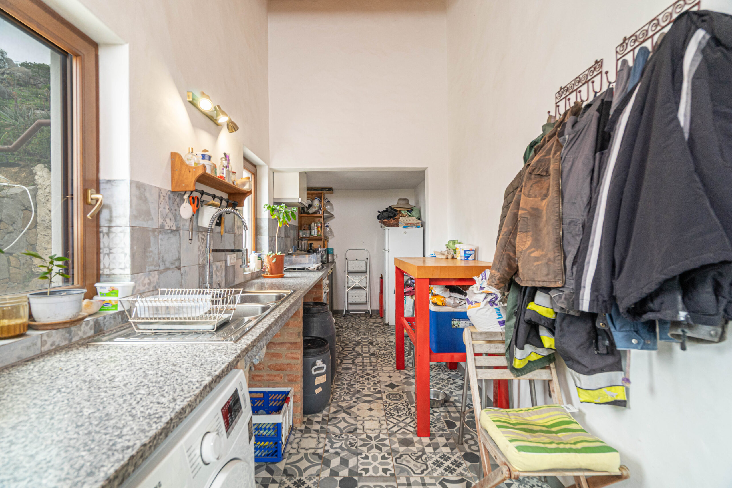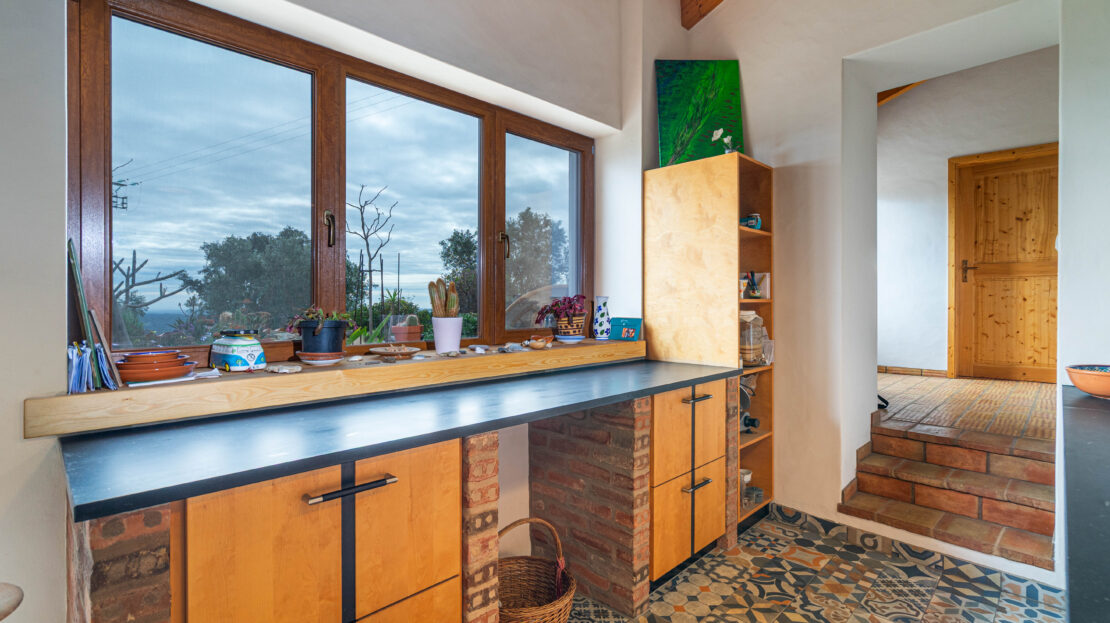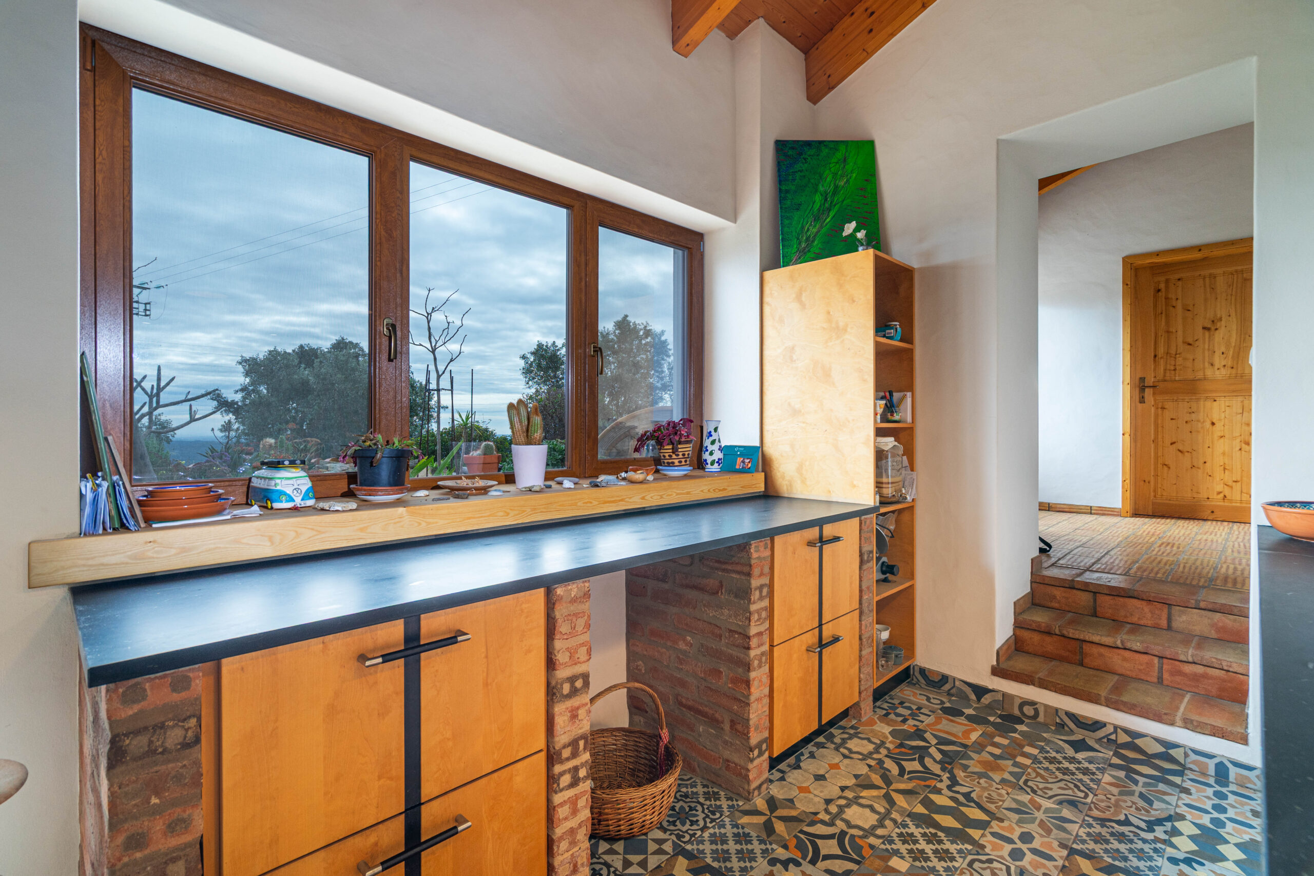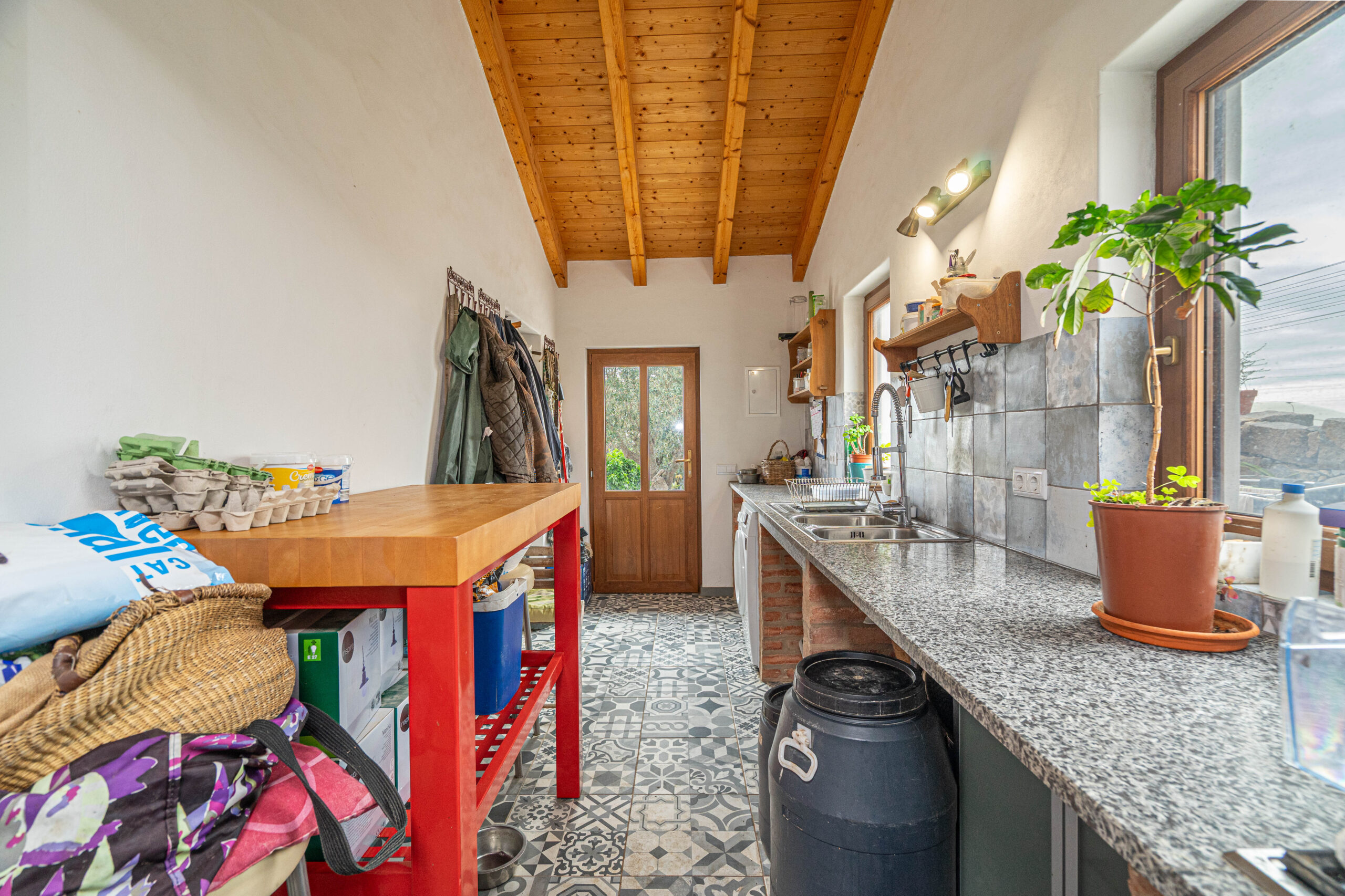 A sala de estar abre-se para um grande terraço com zona coberta, onde se encontra uma cozinha exterior totalmente equipada, com lava-louça, fogão a gás, forno a lenha para pão e área de churrasco. Existe ainda chuveiro exterior e ampla área de apoio, tudo com vistas panorâmicas sobre a paisagem envolvente.