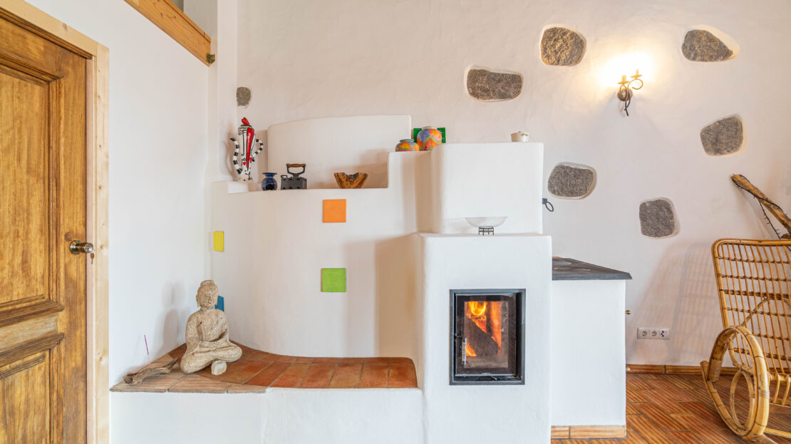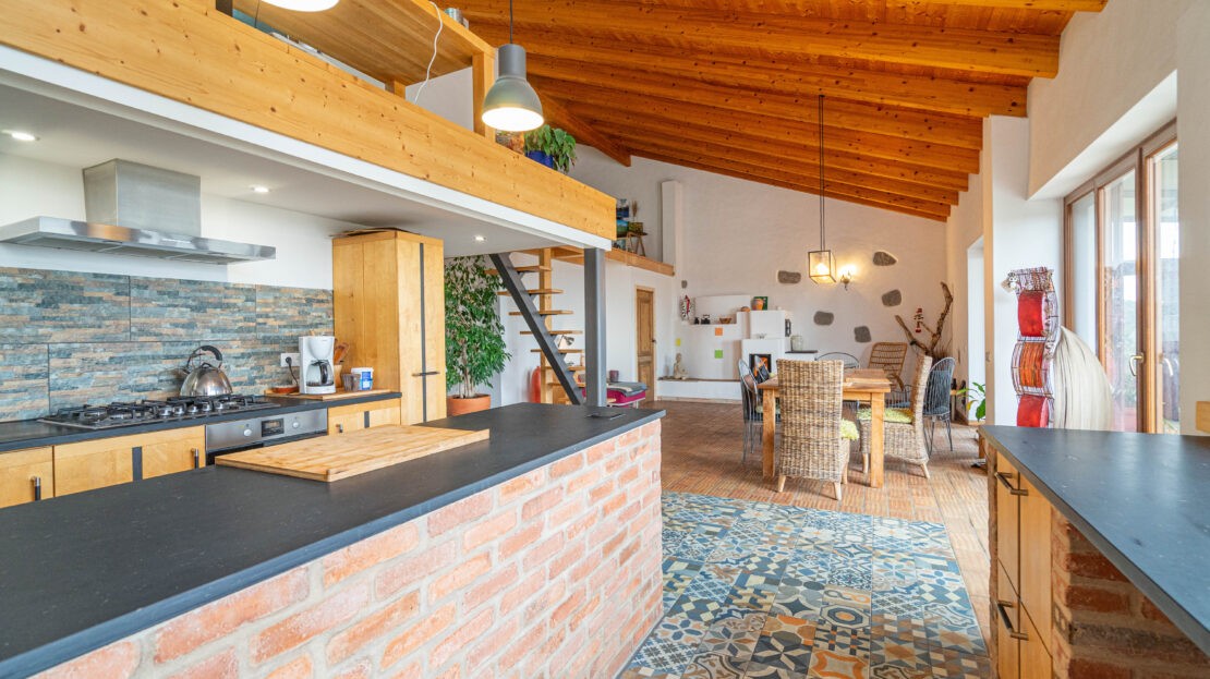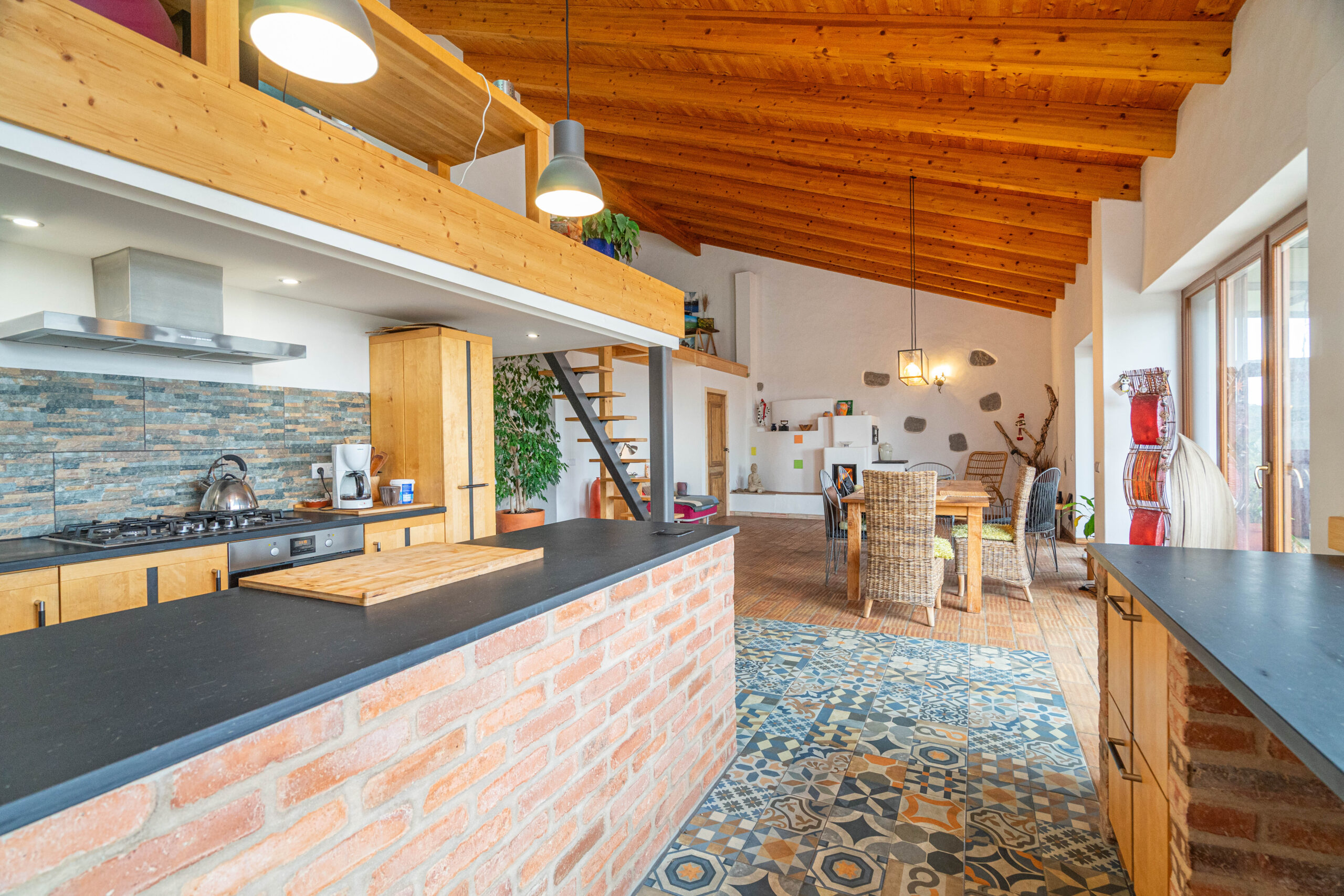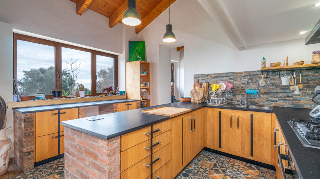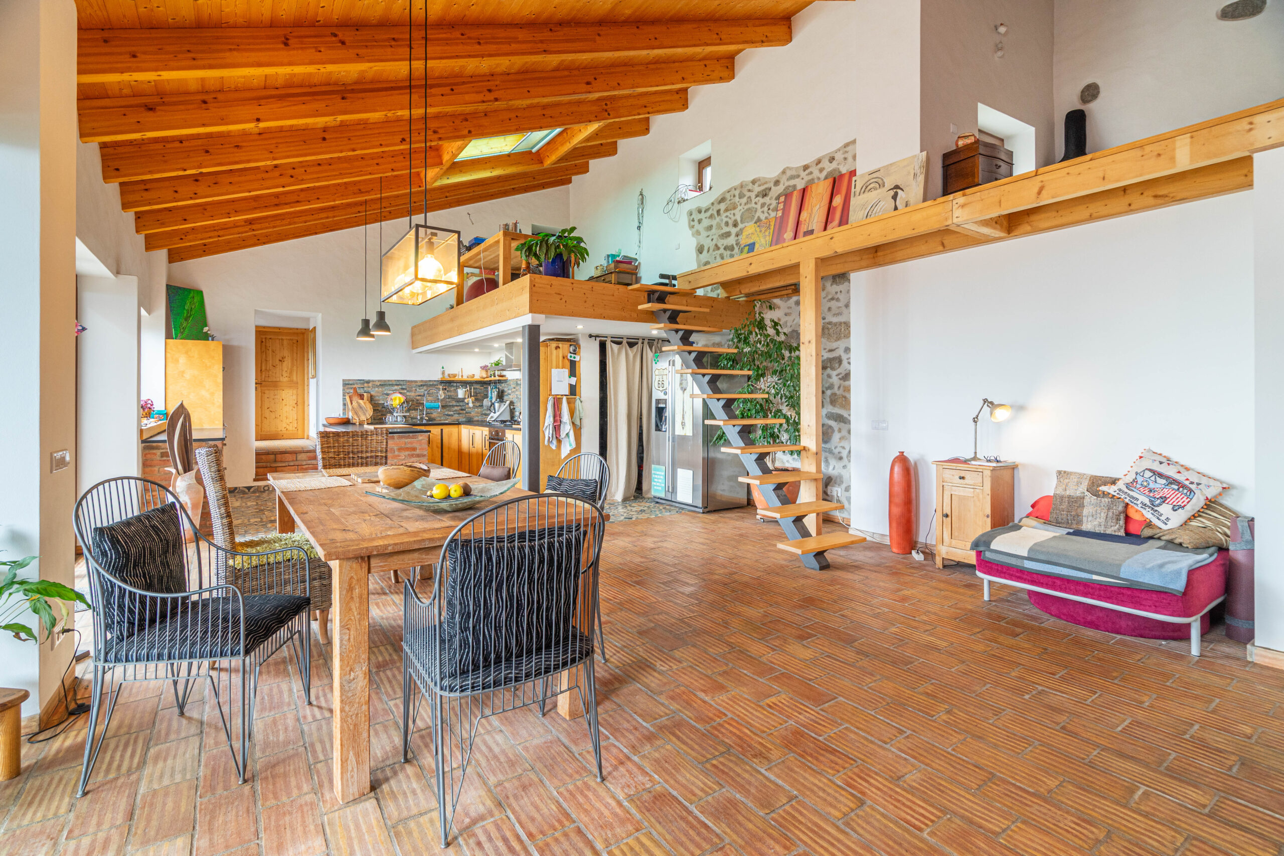 A sala de estar abre-se para um grande terraço com zona coberta, onde se encontra uma cozinha exterior totalmente equipada, com lava-louça, fogão a gás, forno a lenha para pão e área de churrasco. Existe ainda chuveiro exterior e ampla área de apoio, tudo com vistas panorâmicas sobre a paisagem envolvente.