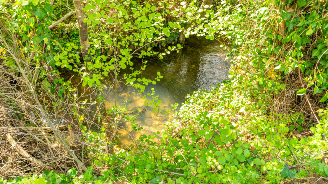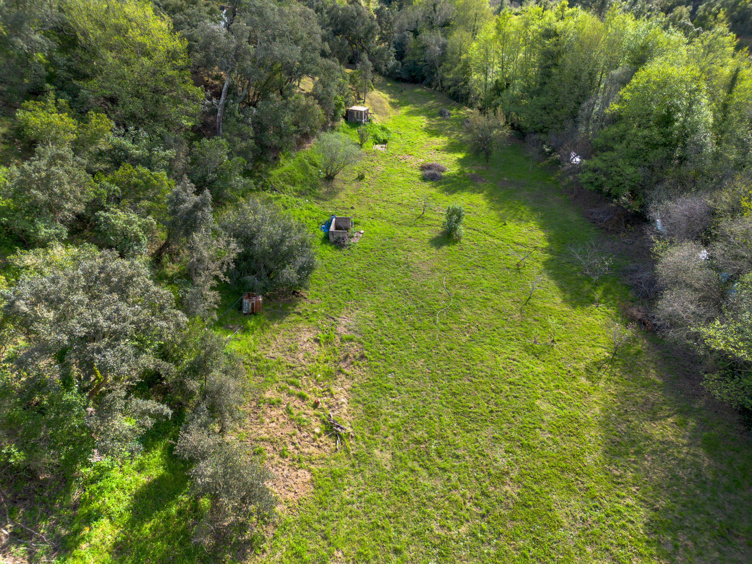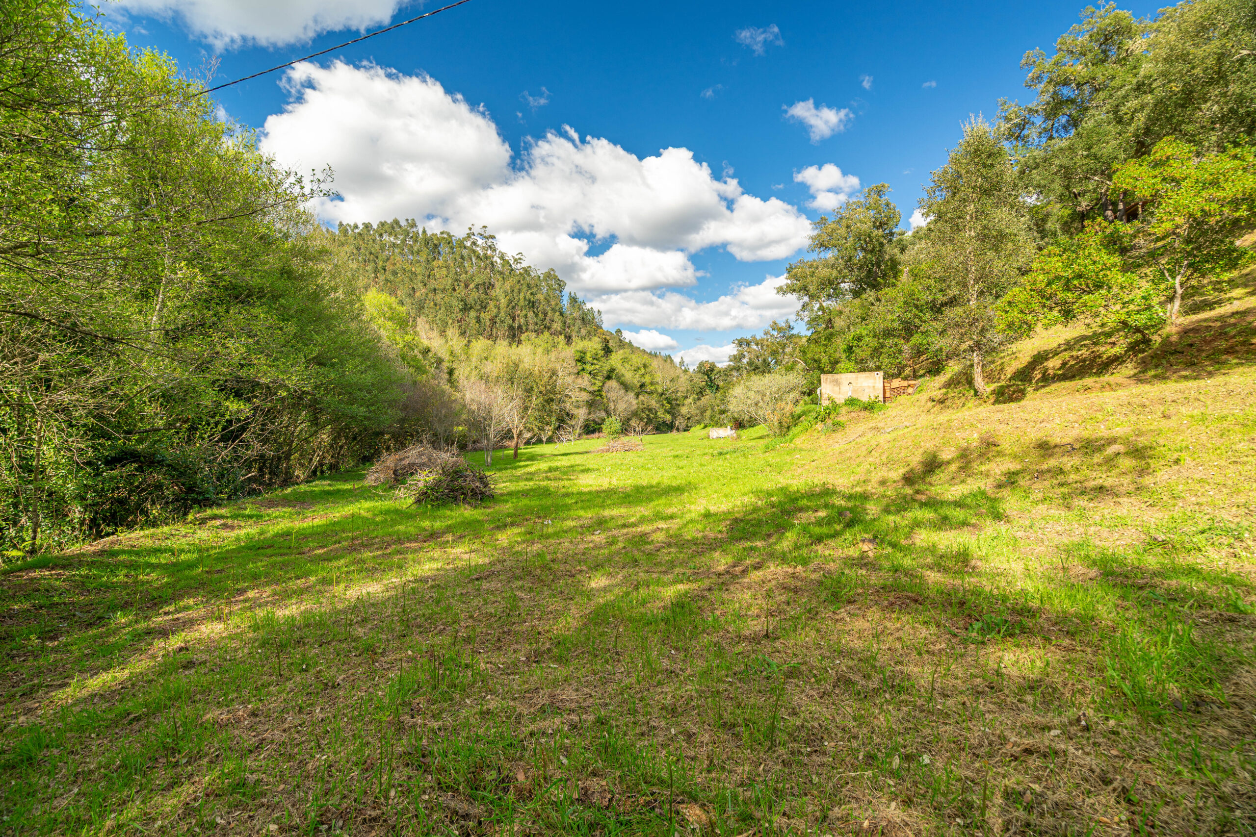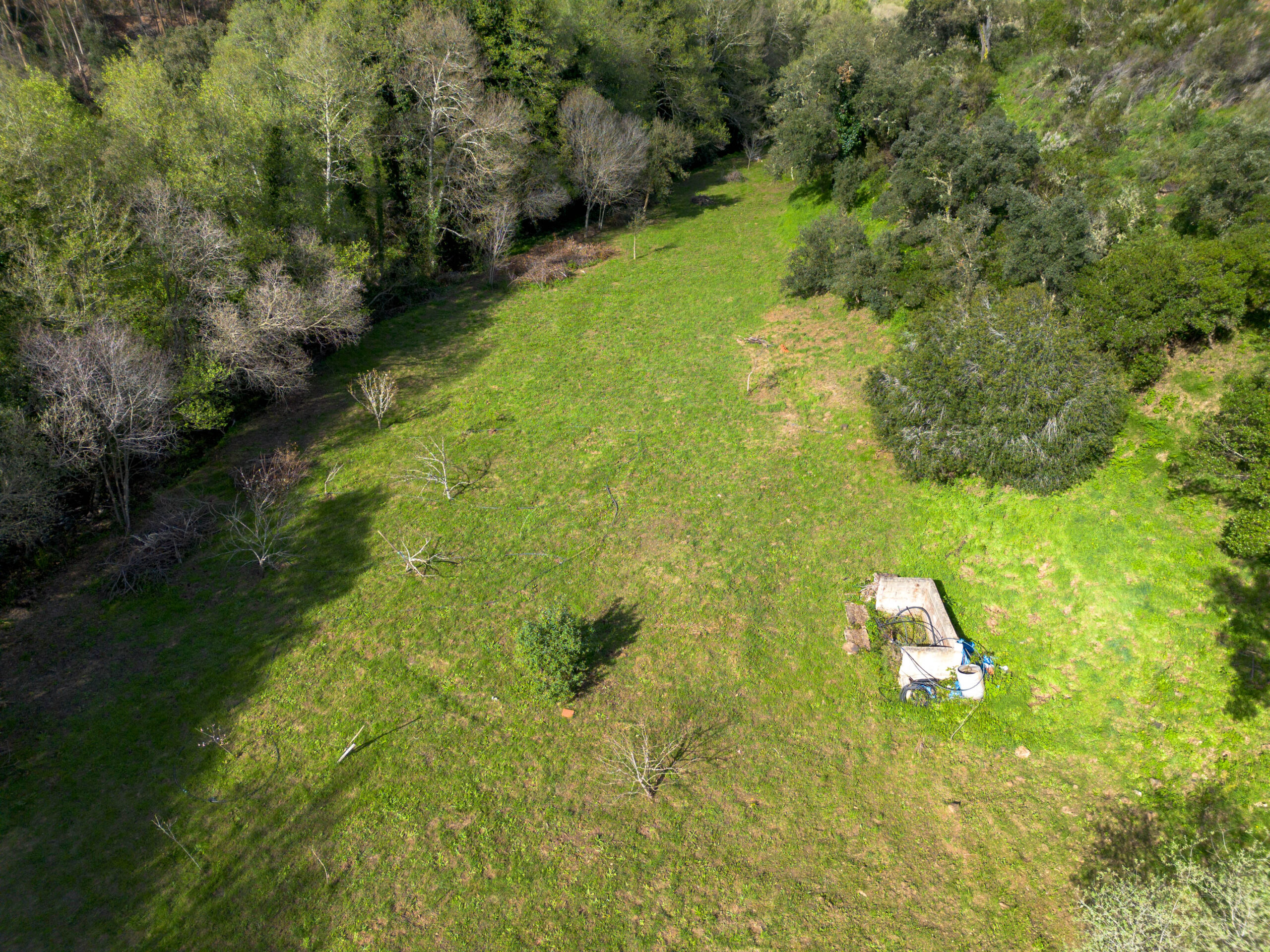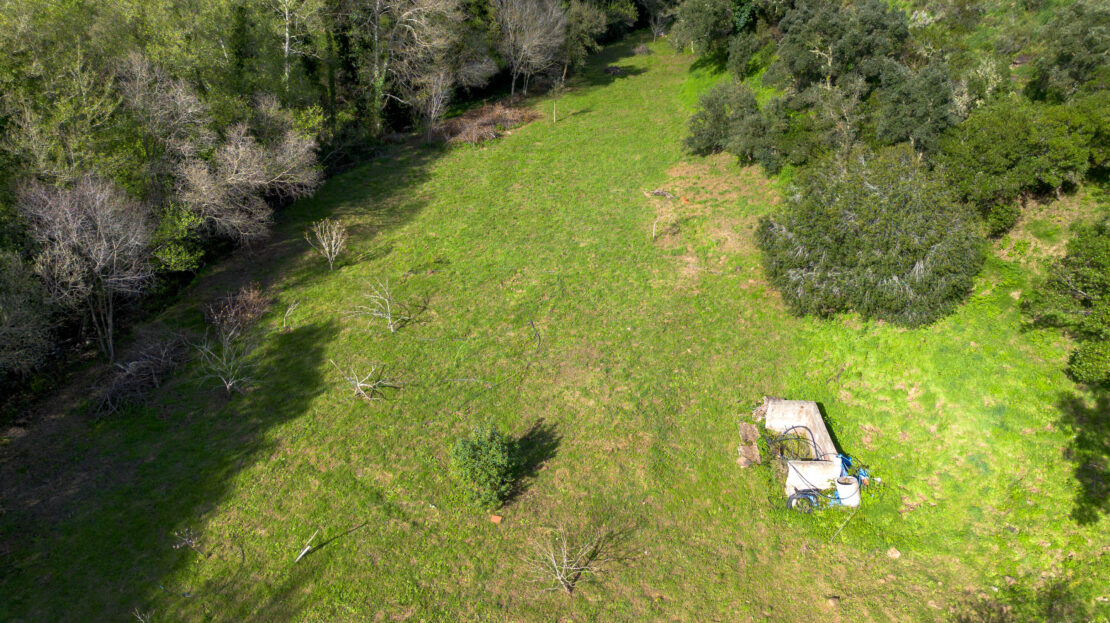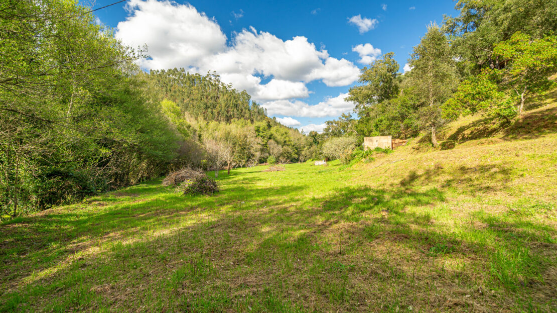 No terreno destaca-se um elemento raro: uma ampla área plana junto à ribeira, que corre com água abundante, criando um cenário natural de grande beleza e potencial.