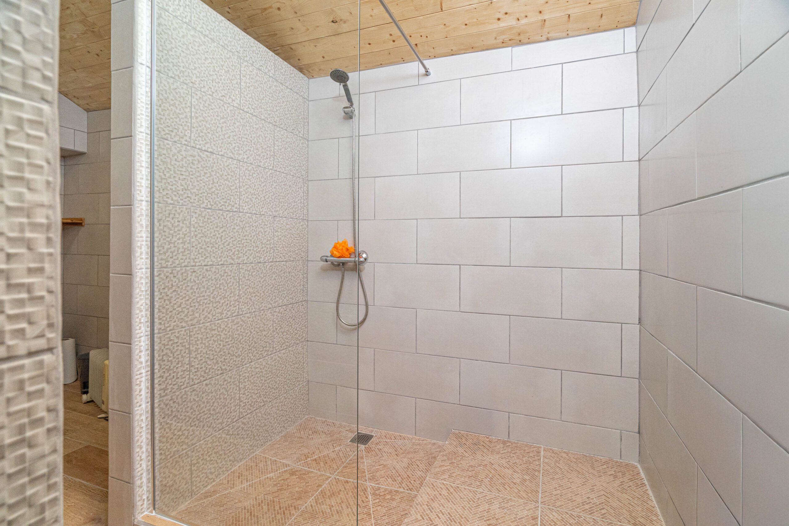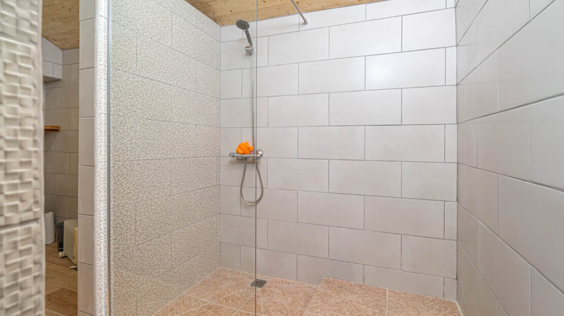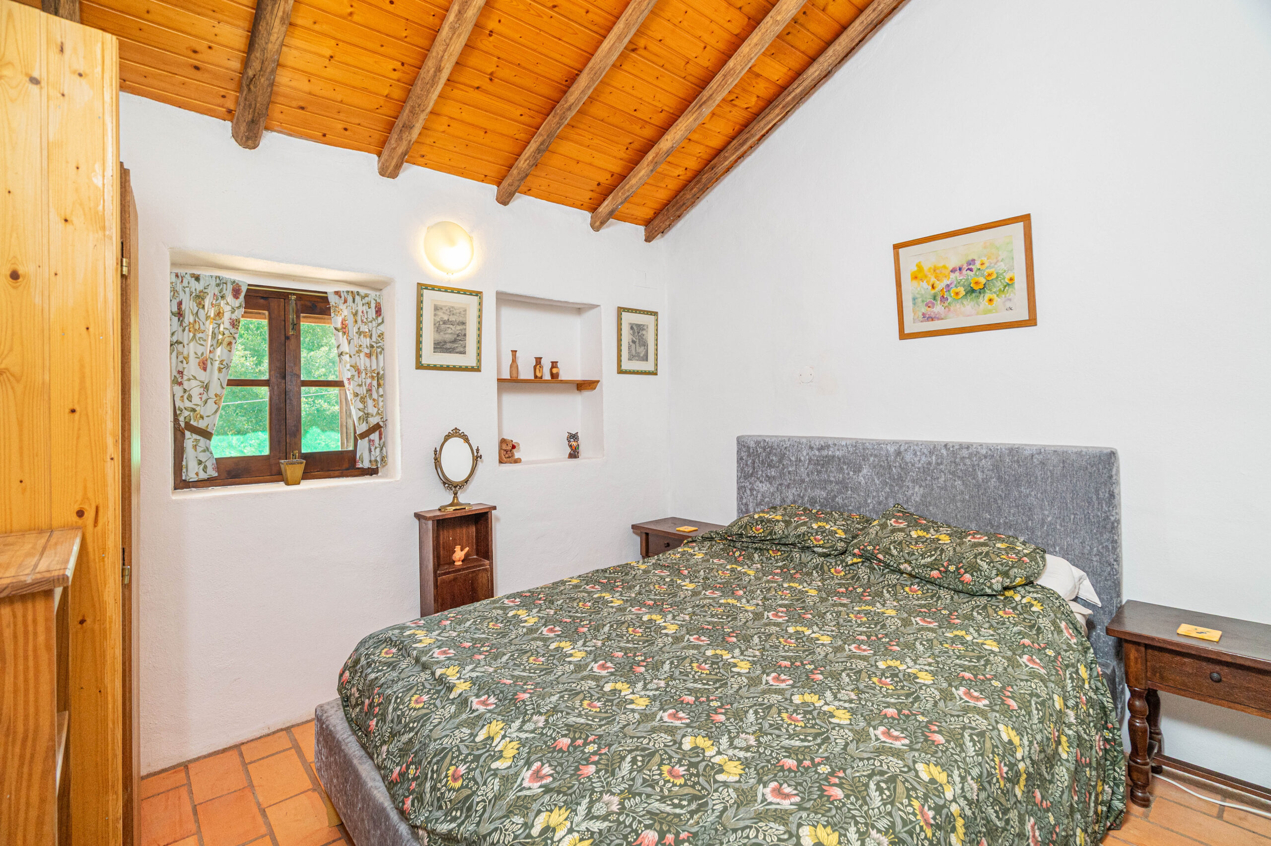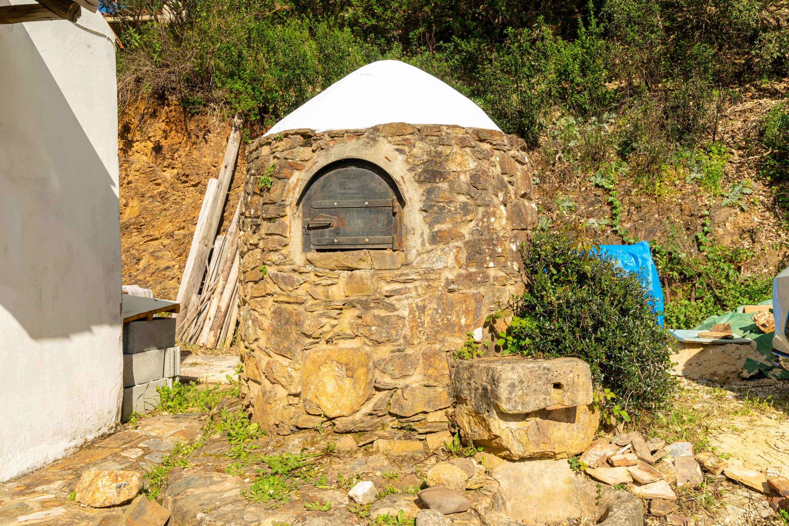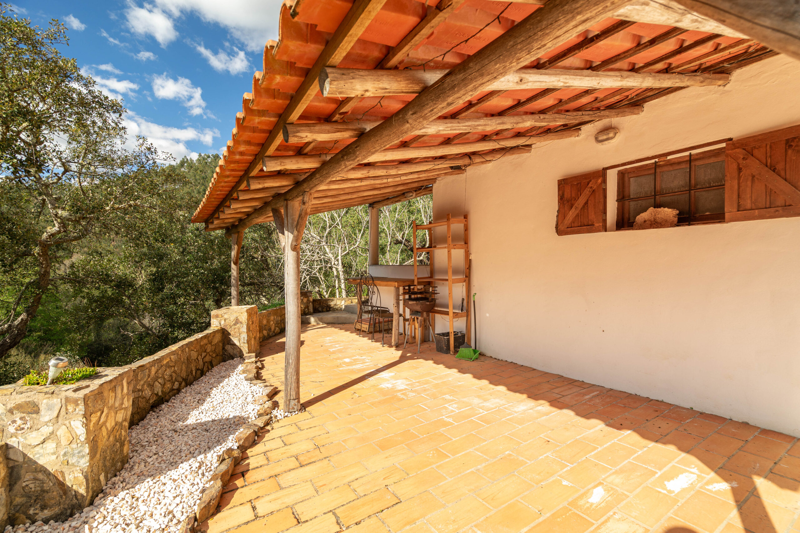 No terreno destaca-se um elemento raro: uma ampla área plana junto à ribeira, que corre com água abundante, criando um cenário natural de grande beleza e potencial.
