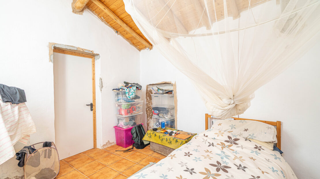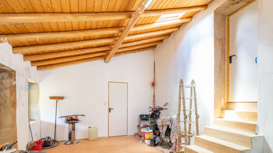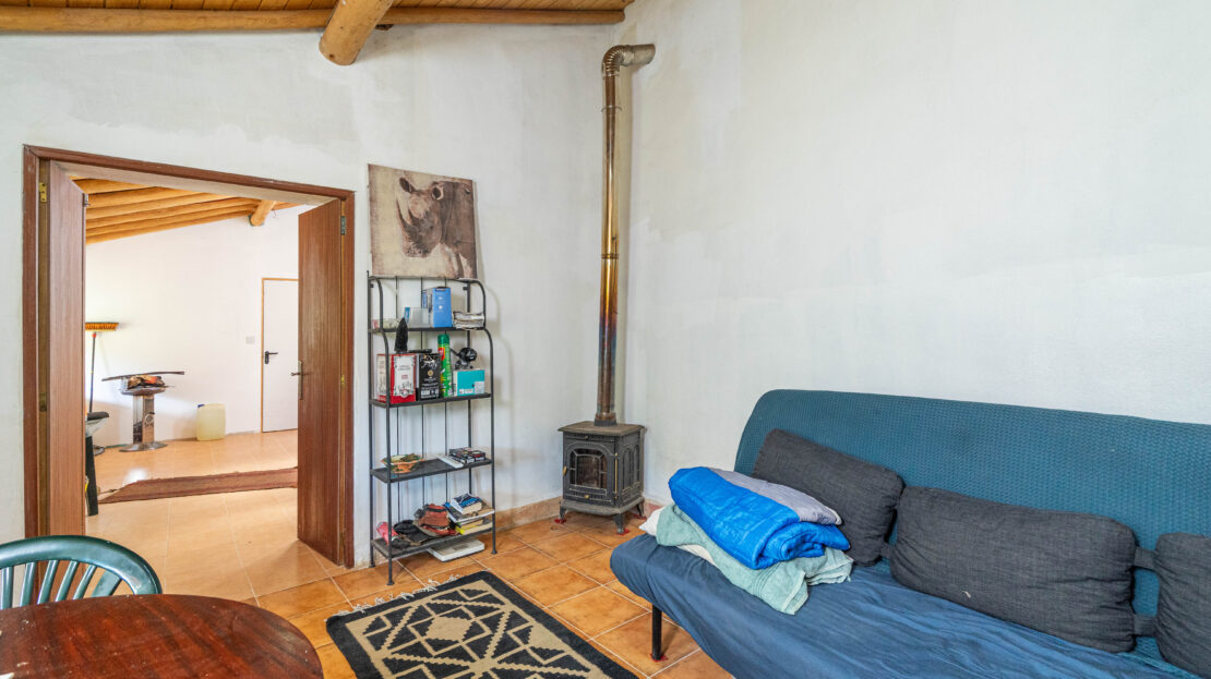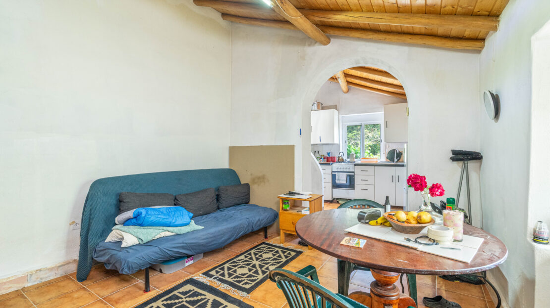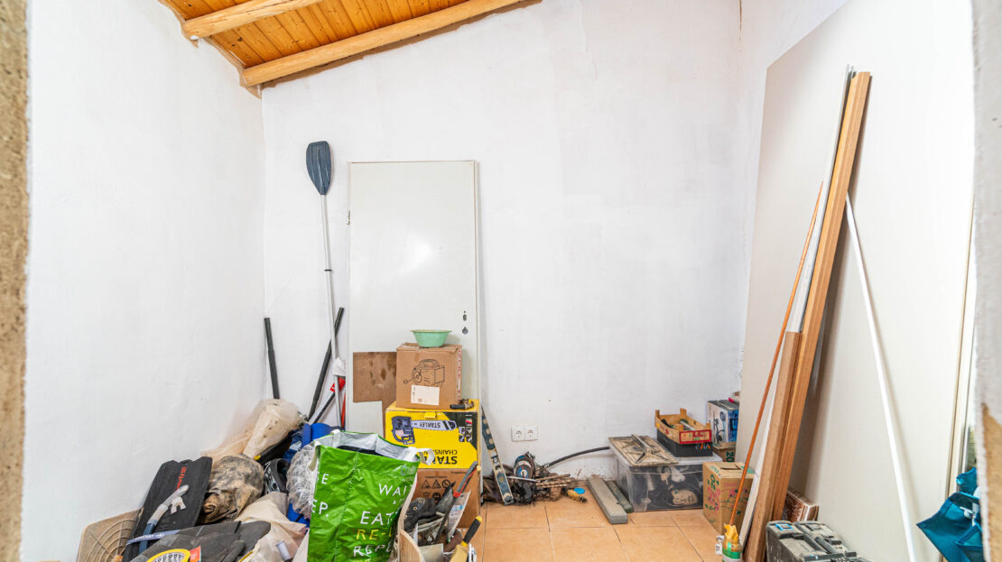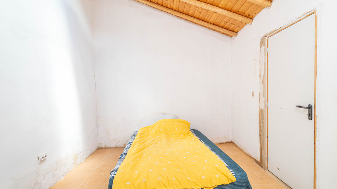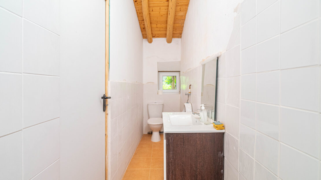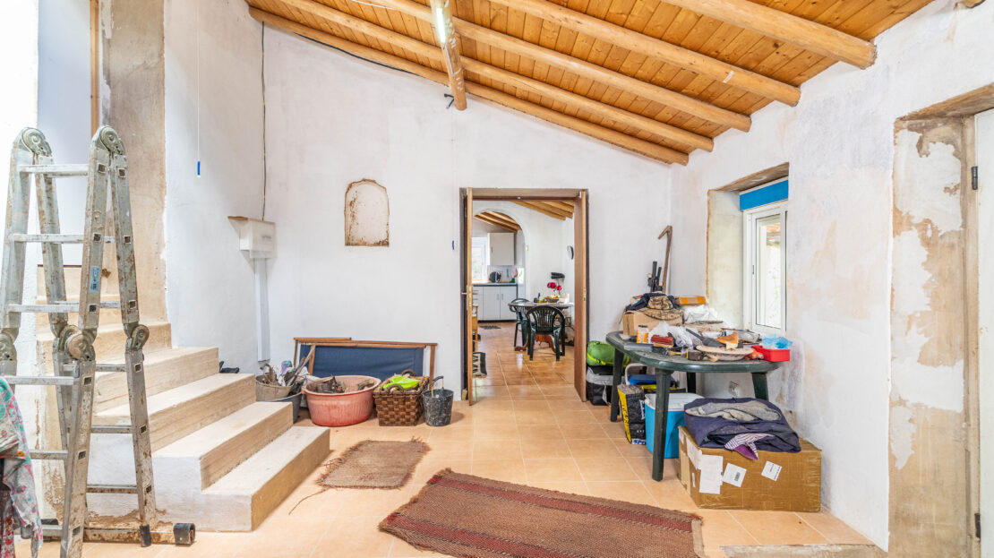 A propriedade dispõe de uma moradia térrea renovada, composta por cozinha funcional, salas amplas e luminosas, dois quartos (um deles em suite), duas casas de banho e ainda uma divisão adicional atualmente utilizada como arrecadação.