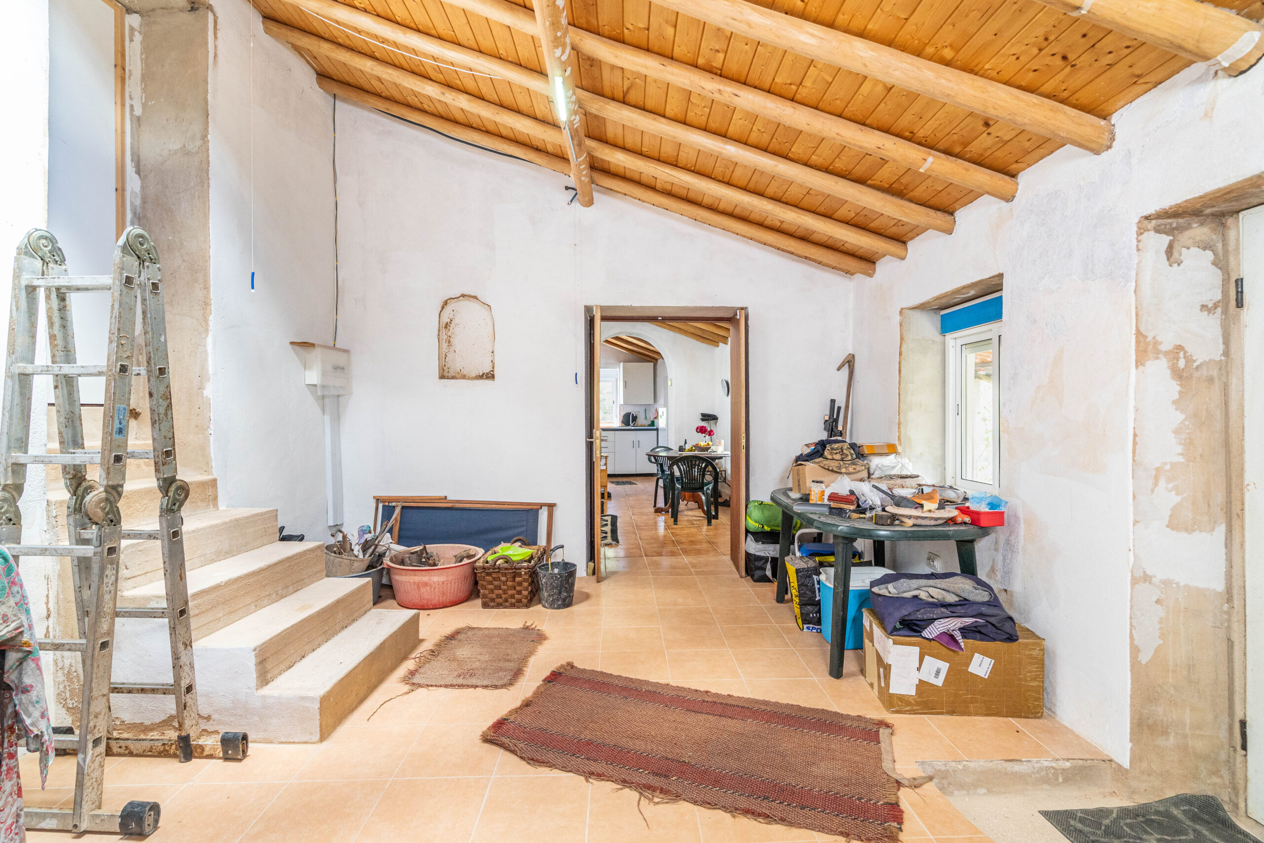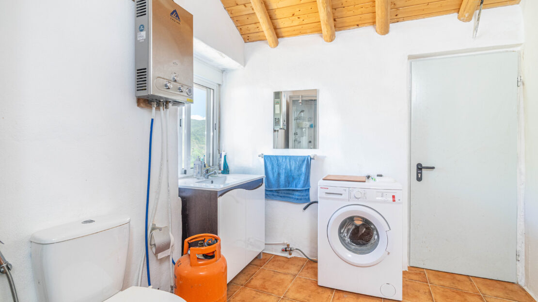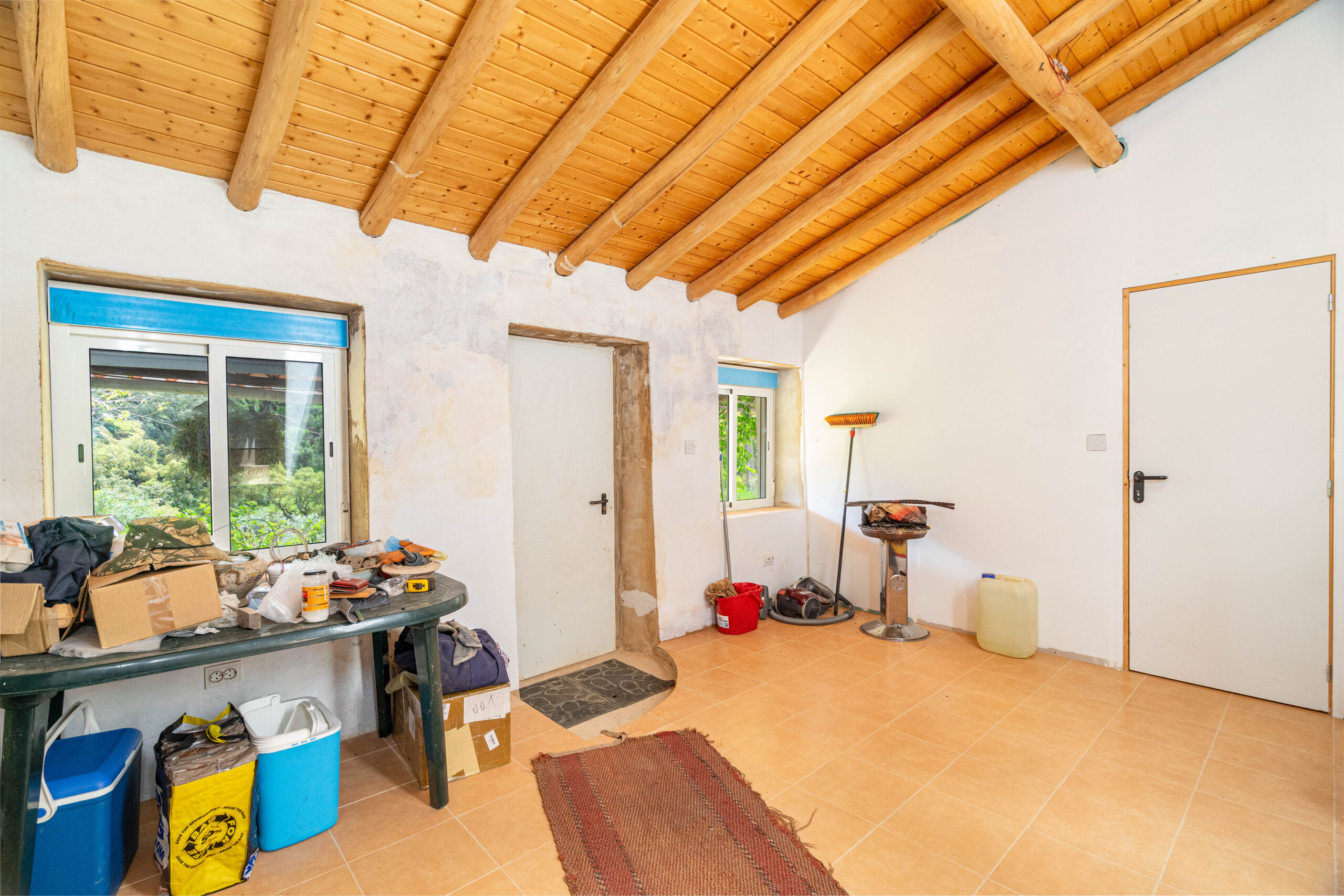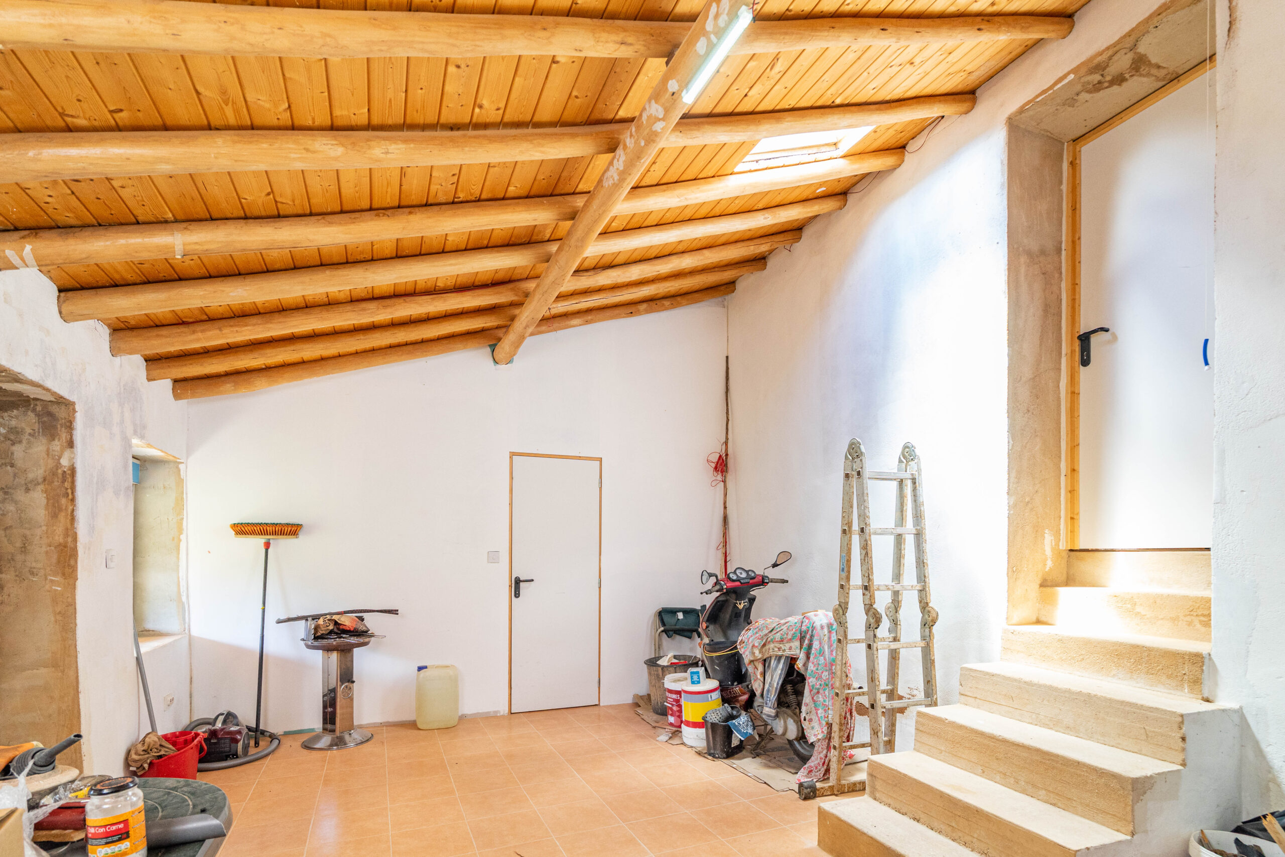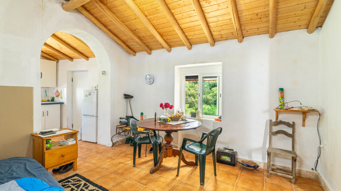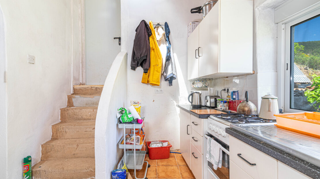 A propriedade dispõe de uma moradia térrea renovada, composta por cozinha funcional, salas amplas e luminosas, dois quartos (um deles em suite), duas casas de banho e ainda uma divisão adicional atualmente utilizada como arrecadação.